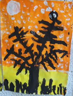 We have been doing the Big Book 'Owl Babies' in English and for art this week we finger painted this entire forest scene of an owl in a tree at night. First we wet the entire page with water and we finger painted the background using orange and yellow paint. When the background was dry we finger painted the tree, bushes and the owl using black paint. When that was dry we added two large white eyes with black pupils. We added stars and the moon. They turned out great - have a look!!!